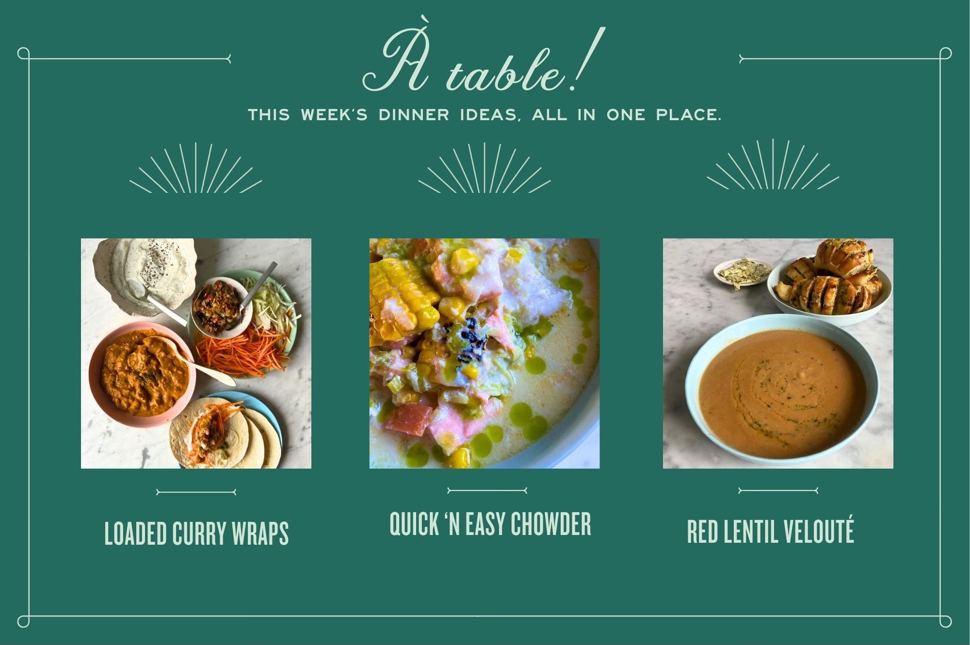 Welcome to À table! Edition 10 — your weekly round-up of simple, flavour-packed dinner ideas, all gathered in one place. If you’re new here, every Monday I pull together three easy suppers to help ease you into the week — a little inspiration to keep things interesting without adding any extra faff.